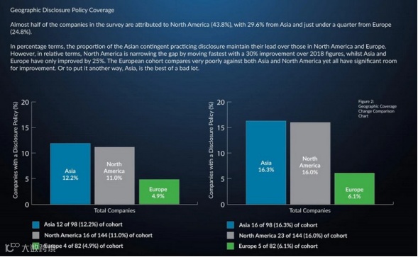 根据全球性调查,拥有符合即将出炉标准或法规的安全漏洞通报措施的欧洲企业比例,低于北美与亚洲的企业。(图片来源:IoT Security Foundation)