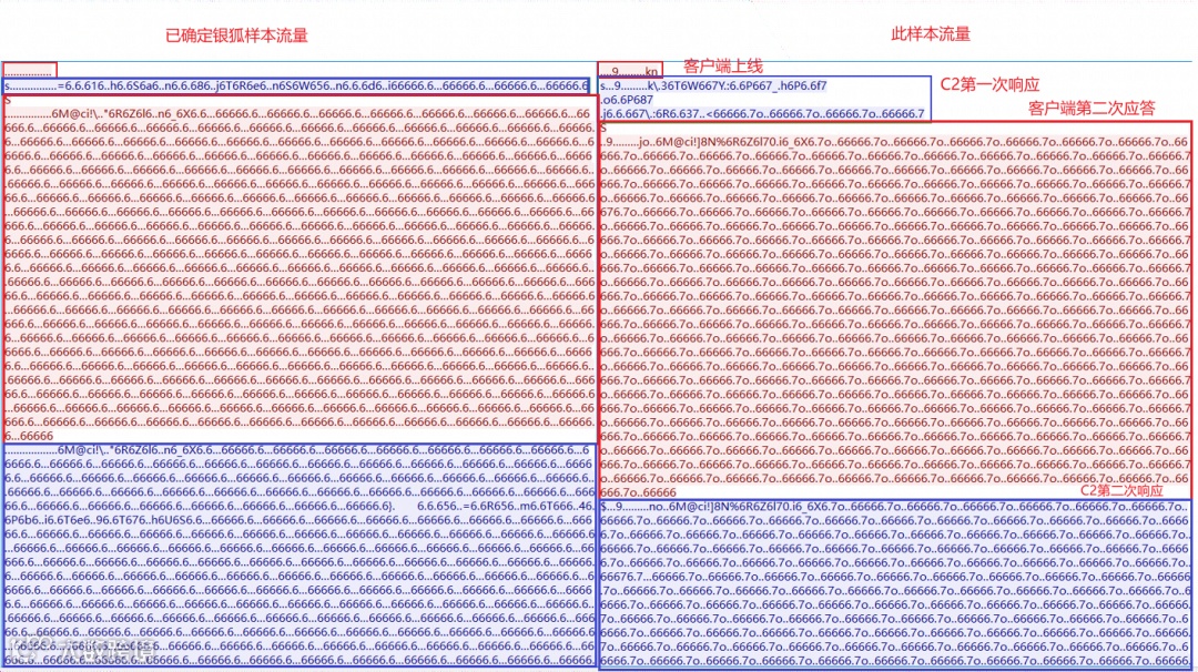 在流量数据中可以看到样本与C2服务器的通信内容如图12所示,反复出现的6666与其他银狐样本行为相似。