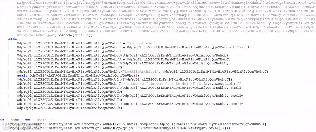 该样本使用PyInstaller打包,其打包Python版本为Python 3.8.0,反编译后得到混淆的Python代码,如图2所示,这是样本的第一阶段Payload。