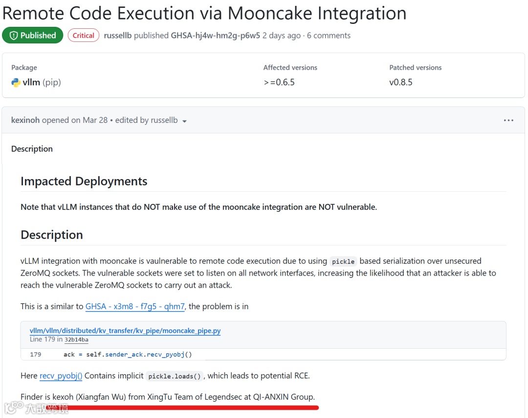 影响: 仅使用 Mooncake 集成的 vLLM 实例受此漏洞影响。成功利用可能导致攻击者完全控制服务器,执行恶意代码,窃取数据或破坏系统。