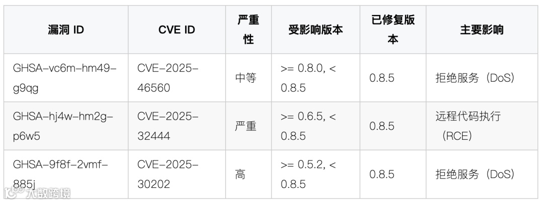 2025 年 4 月 29 日,vLLM 项目发布了安全更新,修复了多个安全漏洞。奇安信星图实验室的安全研究员协助 vLLM 项目修复了其中三个关键漏洞,分别是 CVE-2025-32444、CVE-2025-46560 和 CVE-2025-30202。这些漏洞可能被攻击者利用,引发拒绝服务攻击或远程代码执行,对使用 vLLM 的系统构成严重威胁。其中CVE-2025-32444的CVSS评分达到严重(10.0),成功利用可能导致攻击者完全控制服务器,执行恶意代码,窃取数据或破坏系统。