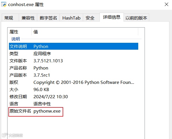 通过查看conhost.exe详细信息,发现其原始文件名为pythonw.exe,如图6所示,所以样本实际是调用pythonw执行了pyw文件: