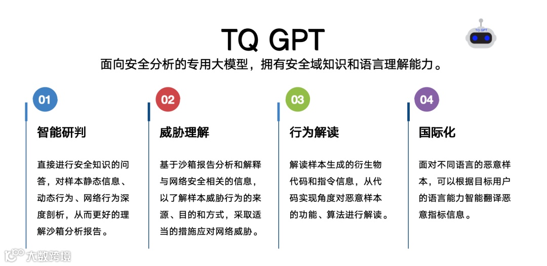 除了对沙箱分析能力的追求,智能化也是天穹沙箱的努力方向。面对恶意样本数量与日俱增、样本分析工程师资源有限的问题,天穹沙箱依托大语言模型发布了TQ GPT功能,提供智能研判、威胁理解和行为解读等功能,探索GPT在恶意代码分析垂直领域的应用,寻求提升样本分析工程师工作效率的新思路。