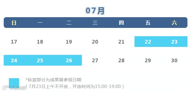 本届成果展将于2022年7月22日开幕,7月26日闭幕,展期共持续5天。(7月23日上午不开放,开放时间为15:00-19:00)