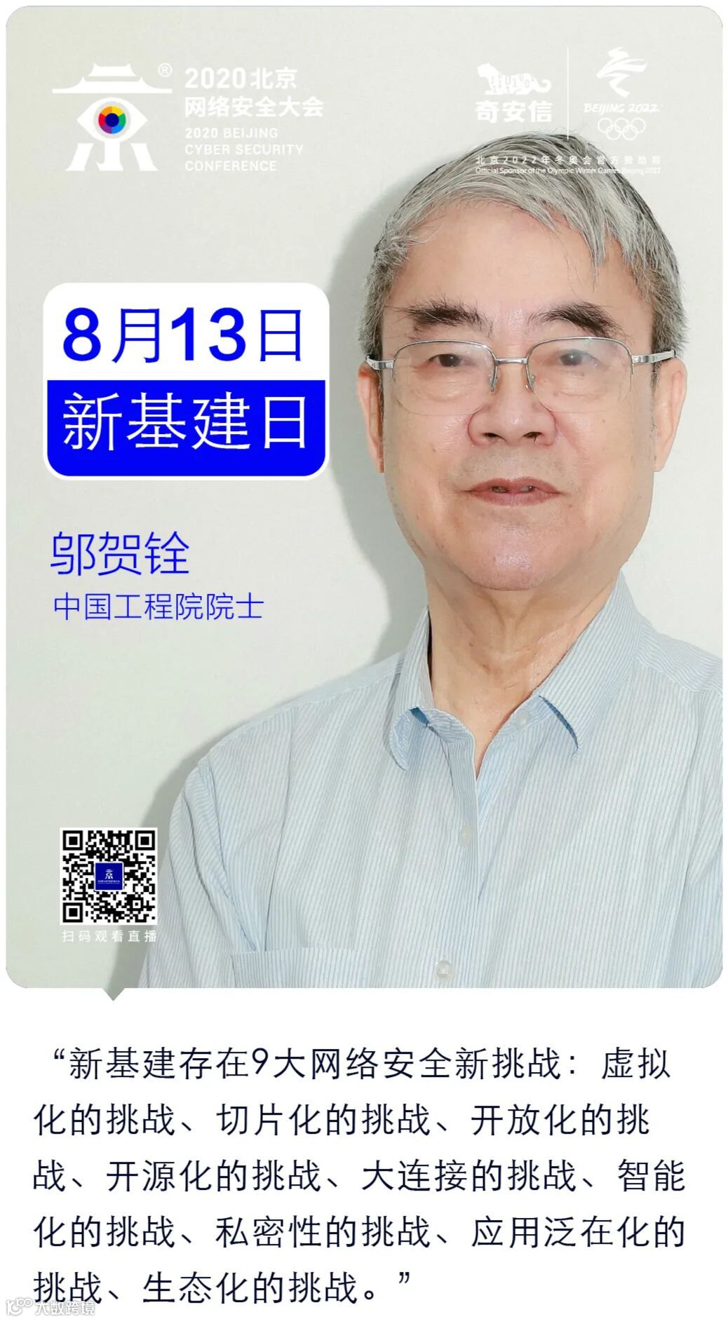 8月13日,北京网络安全大会(BCS 2020)召开了新基建峰会,包括中国工程院院士邬贺铨,国家工业信息安全发展研究中心主任尹丽波,中国信息协会信息安全专业委员会副主任、安天科技集团研究院院长陈晓桦,联合国世界丝路论坛数字经济研究院院长王春晖,工业控制系统产业联盟理事长、国家电网公司国家电力调度控制中心原副主任辛耀中,中电联合创新研究院院长符兴斌,青年长江学者何道敬,奇安信集团副总裁韩永刚在内的专家,就新基建的战略意义、风险管控、安全保障、创新发展进行了分享,并就“内生安全框架”如何护航新基建,展开讨论。
