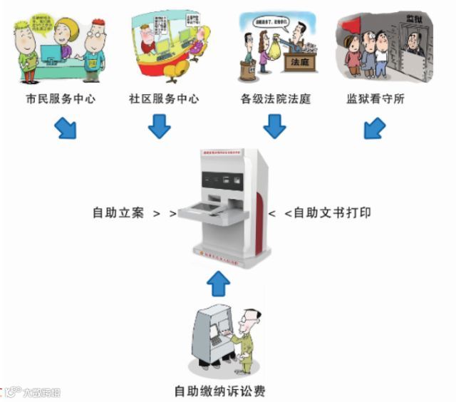 易联众打造的“智慧法院”服务场景包括市民服务中心、社区服务中心、各级法院法庭、监狱看守所、律师事务所,将线上软件与线下设备互联互通,资源得到充分利用。