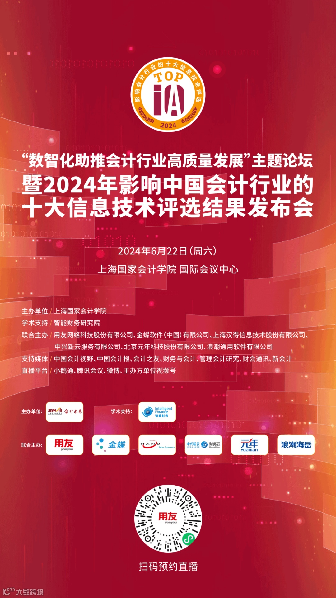 2024年6月22日,由上海国家会计学院主办,用友等多家单位联合主办的“数智化助推会计行业高质量发展”主题论坛暨2024年影响中国会计行业的十大信息技术评选结果圆满举办与隆重发布。