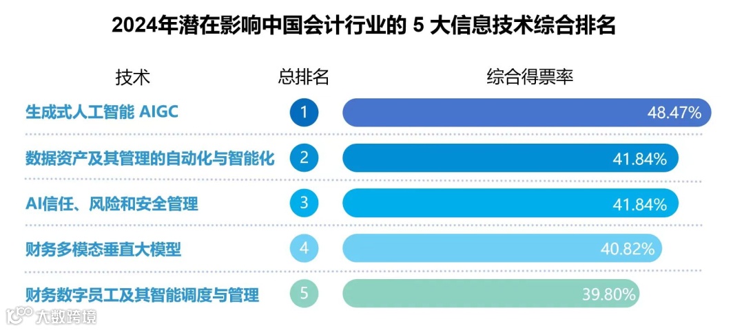 由专家独立提名遴选出的2024 年潜在影响中国会计行业的5大信息技术依次为:生成式人工智能AIGC、数据资产及其管理的自动化与智能化、AI信任、风险和安全管理、财务多模态垂直大模型、财务数字员工及其智能调度与管理。