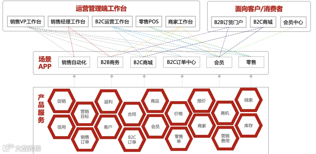 举个例子:用友BIP营销云在中台层面提供了促销、信用、返利、合同、客户等基础公共服务,通过这些基础服务面向某一个特定业务场景构建场景化应用,不同的场景应用组合在一起,又构建了面向营销各类角色的工作台。比如B2B商务,它解决了核心企业面向经销商层面的多层级、网状的渠道服务,这一场景应用在使用层面,被分配给了销售经理、B2B订货门户等多个角色工作台。