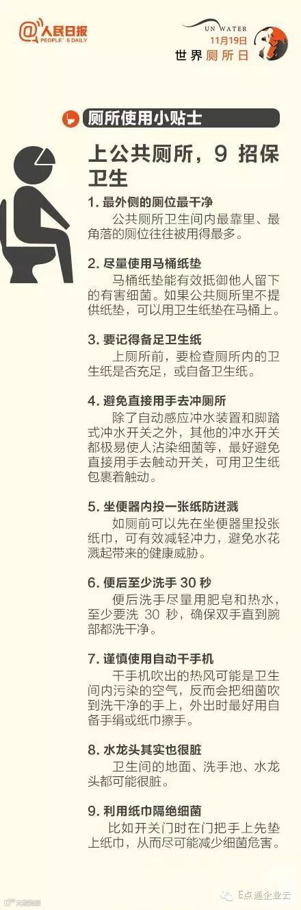 其实,关于厕所也是有很多有趣的数据的,比如人每天要上6到8次厕所、一生约3年时间在厕所度过;当然在厕所的使用上同样有许多注意事项。下面是由人民日报整理制作的世界厕所科普日宣传图,一起来看下吧。