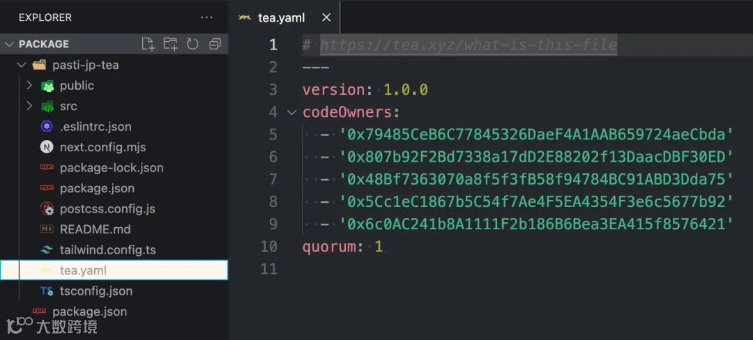 在这些软件包中都明显的包含了tea.yaml标识文件。例如,在npm包ayogasteros-tea中的tea.yaml 文件中就声明了多个哈希值,以用来标识维护者的身份。