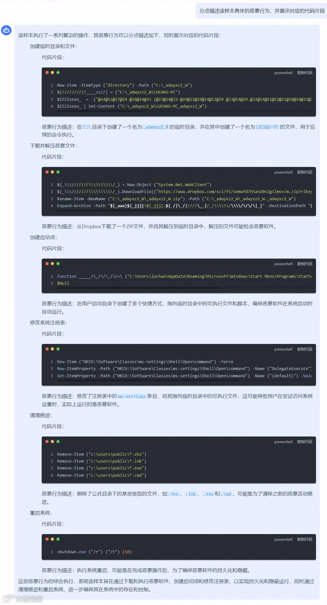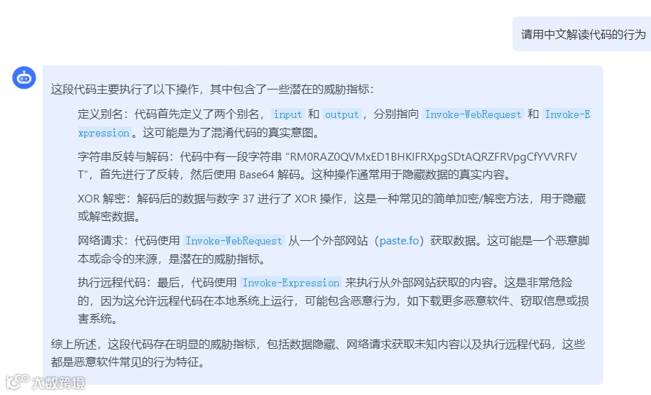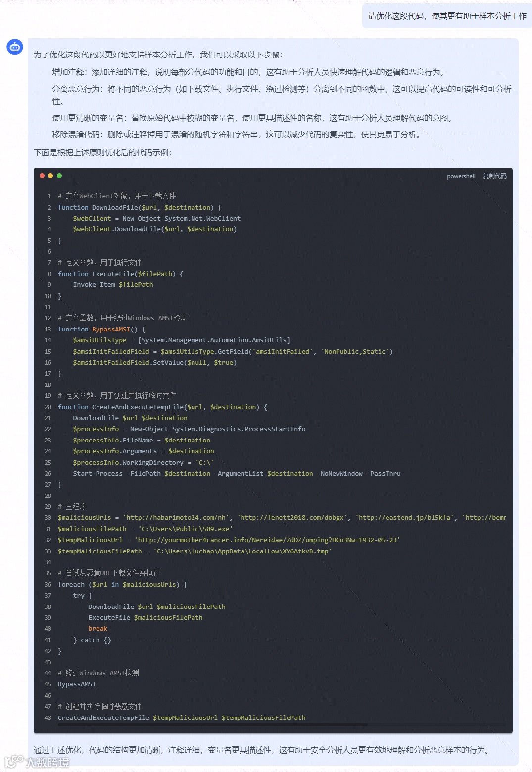 同时,天穹沙箱针对之前的TQGPT功能进行升级,赋予其强大的代码解读功能,此功能可帮助用户总结代码功能、提取IOC信息、分析恶意行为、优化代码输出、C2研判、评估威胁等级和代码仿写(禁止用于恶意用途)等,其全面深入的代码分析能力极大的提升了脚本类样本的分析效率,为安全人员提供了强大的工具,帮助安全人员快速定位威胁。