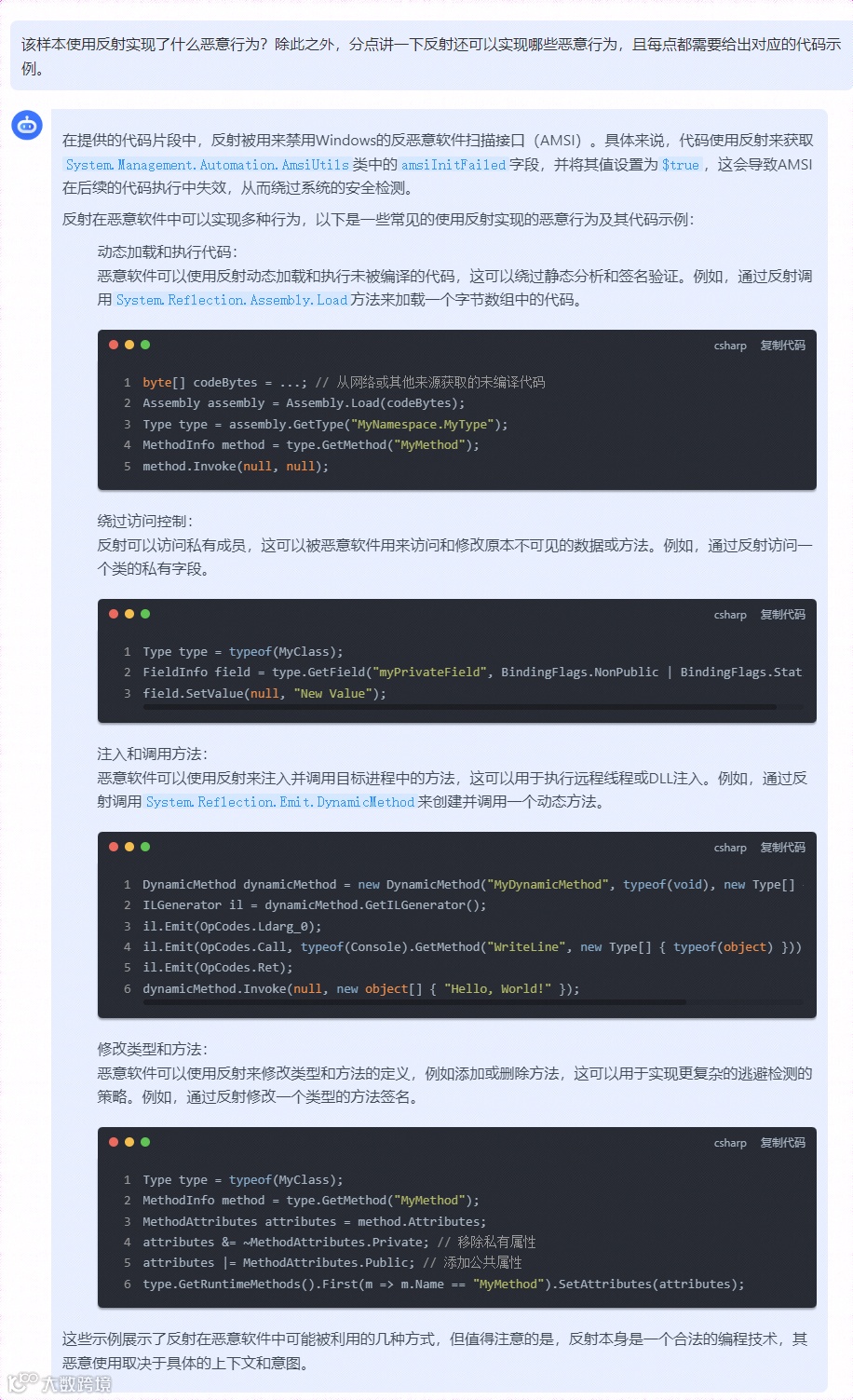 问题3:该样本使用反射实现了什么恶意行为?除此之外,分点讲一下反射还可以实现哪些恶意行为,且每点都需要给出对应的代码示例。
