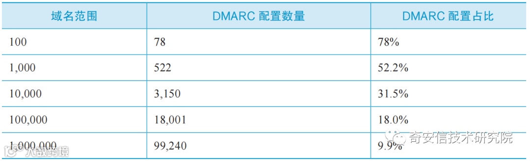 此外,因为DMARC协议是基于SPF和DKIM验证结果构建的身份验证系统,所以它的部署率必然要低于SPF和DKIM协议,但重要性却要高于其他两个协议,一旦部署率过低,就会直接影响邮件安全拓展协议对于邮件伪造的保护效果。