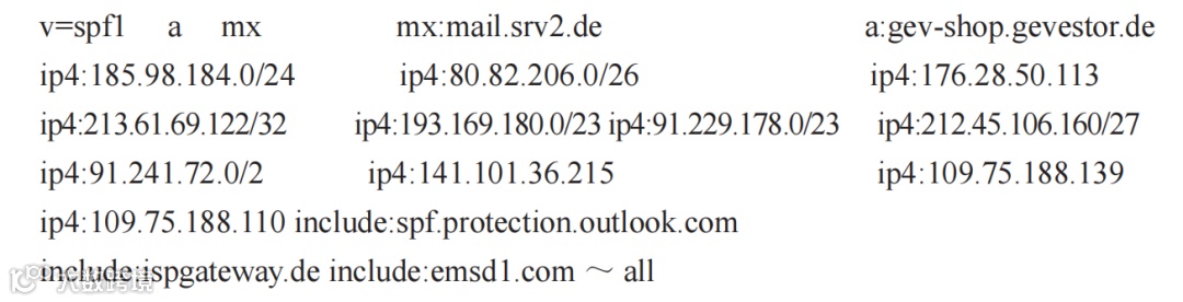 SPF本意是标识发信方邮件服务器的IP地址,用于确认发送方身份。但在实际的使用过程中,很多域名所有者会将CIDR配置得宽泛一些,这样可以提前预留出增加邮箱服务器的地址空间,或者方便服务器的IP地址更换。如果配置的CIDR范围内的IP地址全为该域名所有者,则不会出现问题,但是在实际情况中有很多域名配置的CIDR范围超过了其实际掌控范围,SPF记录中的很多IP地址并不被域名所有者所掌握,攻击者只需要拿到一个这样的IP地址,就可以发送伪造邮件且通过SPF校验。这破坏了SPF将IP地址用于身份校验的安全基础。例如某网站的SPF记录如下所示: