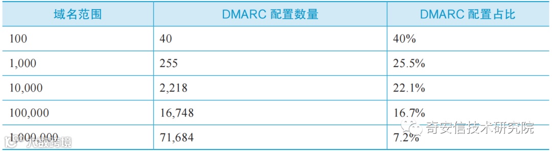 表1-14显示了SecRank Top 100万域名的DMARC梯度部署率情况,其中有7.2%的域名部署了DMARC记录。分别对不同排名范围的域名进行测量,发现随着测量范围的扩大,DMARC的部署率明显下降。因为知名域名往往有更大的动力防止域名伪造攻击。DMARC的部署技术难度比较高也是影响普通域名对其部署的关键因素。对Alexa Top 100万域名的扫描结果如表1-15所示。