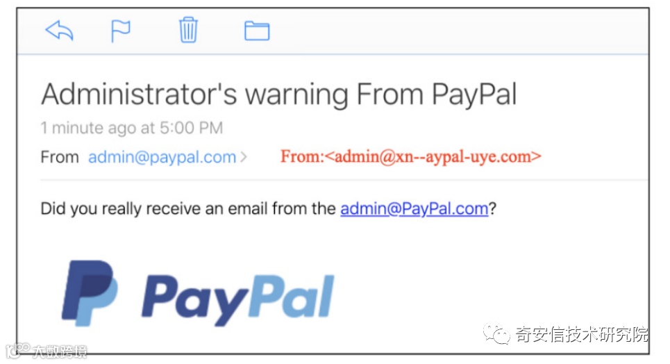 图1-43 利用IDN同形异义词攻击冒充admin@paypal.com对iCloud邮箱发起伪造攻击示例
