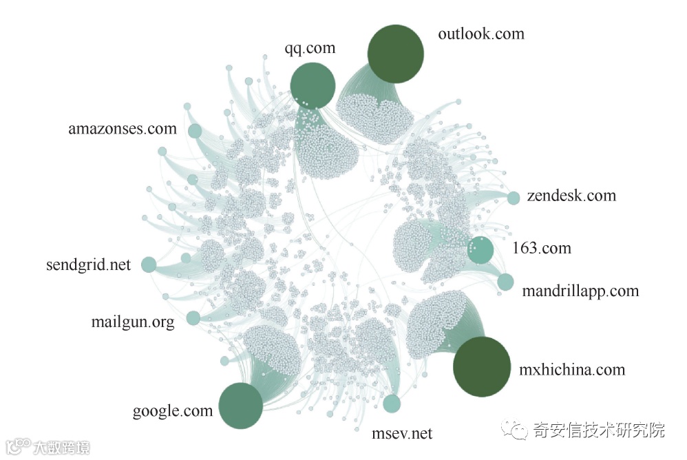 测量结果显示,在配有SPF记录的SecRank Top 100万域名中有61.8%的SPF记录使用了“include”机制。大量的电子邮件提供商会给其客户配置使用“include”机制的SPF记录,这带来的一个问题就是SPF记录中包含的IP地址可能不被域名所有者掌控。如图1-40绘制的近期部分知名邮件提供商的SPF依赖关系所示,每一家邮件提供商的SPF记录都覆盖了很多企业、学校、政府部门。甚至还存在部分域名同时在SPF记录中包含了多家邮件提供商的IP地址,这进一步增大了其SPF保护失效的风险。例如某著名的手机企业,在SPF记录中同时“include”了163.com、outlook.com和zendesk.com共3家邮件提供商。其SPF记录如下所示: