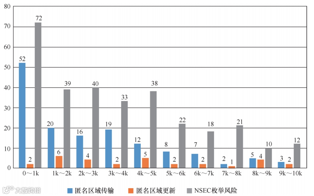 图1-8 SecRank Top 1万域名中存在匿名区域传输、匿名区域更新和NSEC枚举风险的域名数量