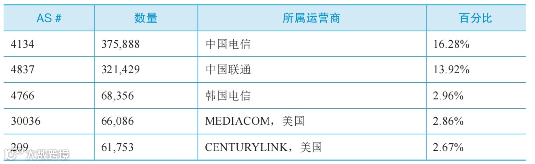 从自治系统的粒度来看,存在开放递归解析服务器数量最多的5个自治系统分别为AS4134、AS4837、AS4766、AS30036以及AS209。上述自治系统所对应的网络服务提供商、数量及占比情况如表1-1所示。