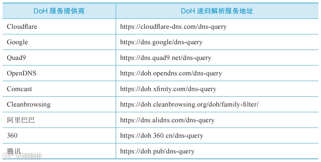 表1-6 主要DoH服务提供商及其DoH解析服务地址