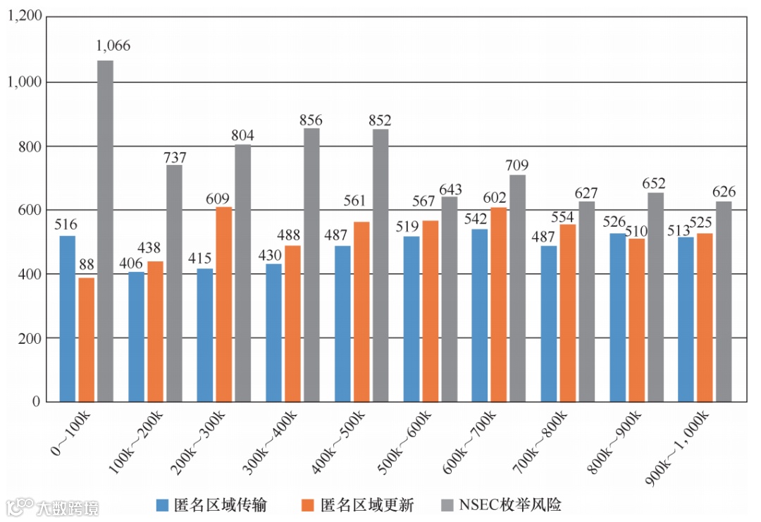 图1-9 SecRank Top 100万域名中存在匿名区域传输、匿名区域更新和NSEC枚举风险的域名数量