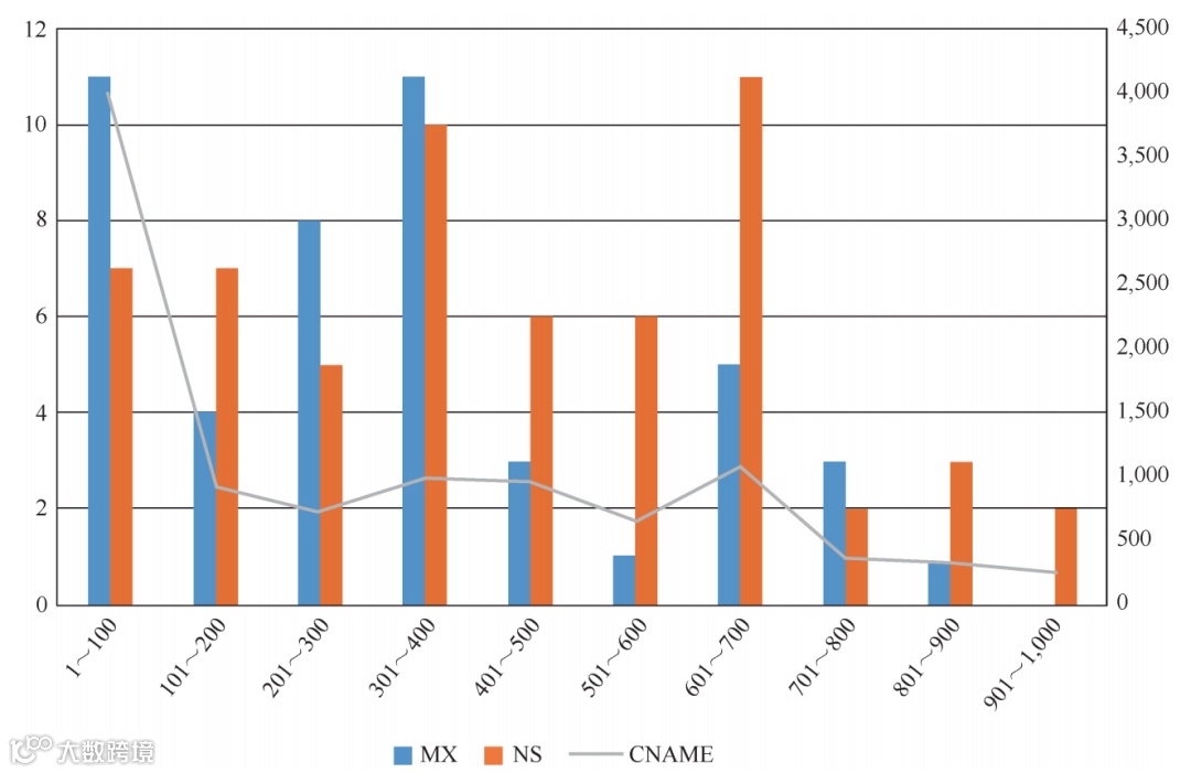 图1-13 Alexa Top 1,000域名中存在接管风险的不同解析类型子域名数量(说明:左纵坐标为MX、NS记录数量,右纵坐标为CNAME记录数量)