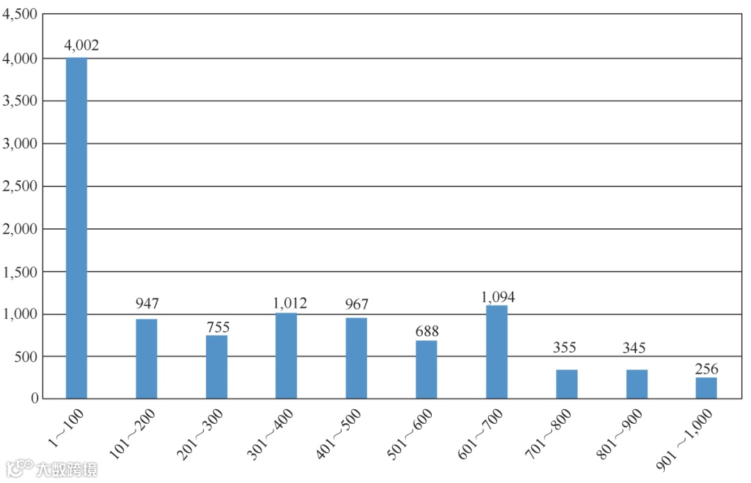 结果表明(见图1-10),1,000个知名域名中共有496个二级域名存在安全风险,累计发现10,421个存在风险的子域名,风险子域名最长解析链节点数为6。需要注意的是,排名靠前的二级域名反而更可能存在风险并拥有更多的风险子域名,例如排名前100的二级域名拥有4,002个风险子域名,达到总风险子域名的38.4%。