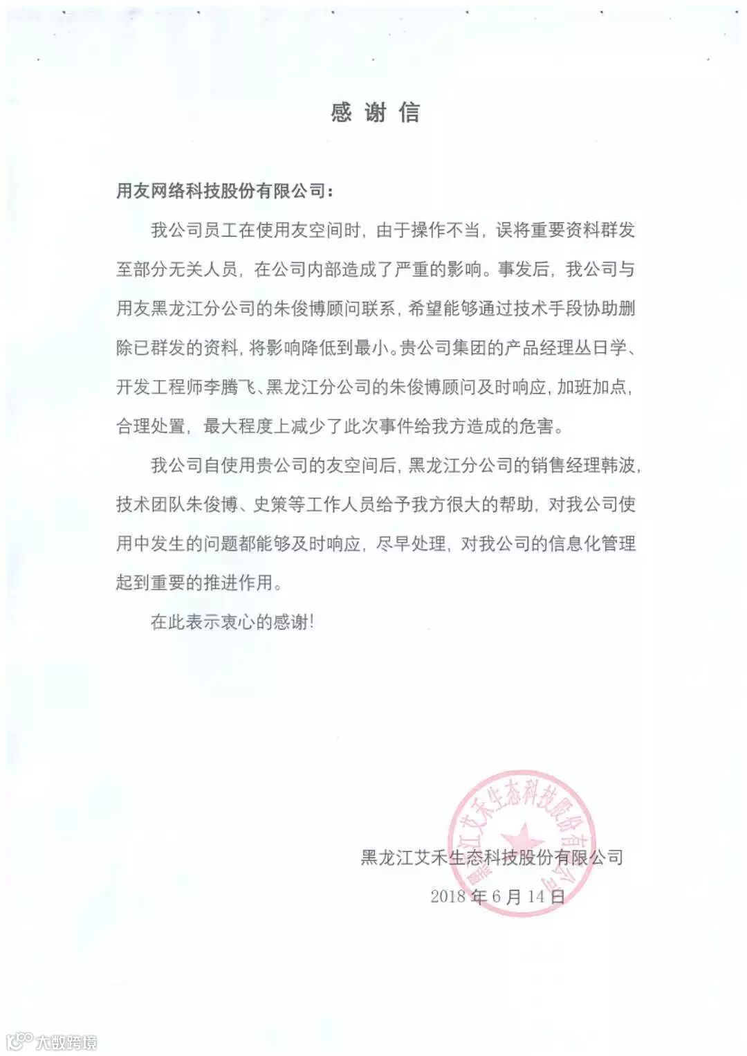 近日,用友网络科技股份有限公司黑龙江分公司收到一封来自客户的感谢信,客户黑龙江艾禾生态科技股份有限公司在信中对用友黑龙江分公司销售经理韩波、实施顾问朱俊博、史策,用友集团产品经理丛日学、开发工程师李腾飞等人员给予了充分的肯定,并对他们表示感谢。