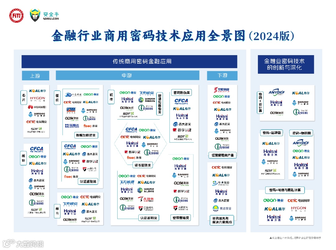为切实缓解金融机构在商用密码应用改造和评估工作中面临的产品选型挑战,深化商用密码在数据安全保护中的应用,推动商用密码的金融创新,并呈现商用密码的金融应用生态,研究所与安全牛开展合作,通过企业自主申报与银企两侧的多轮调研与筛选,现正式发布《金融行业商用密码技术应用全景图(2024版)》。