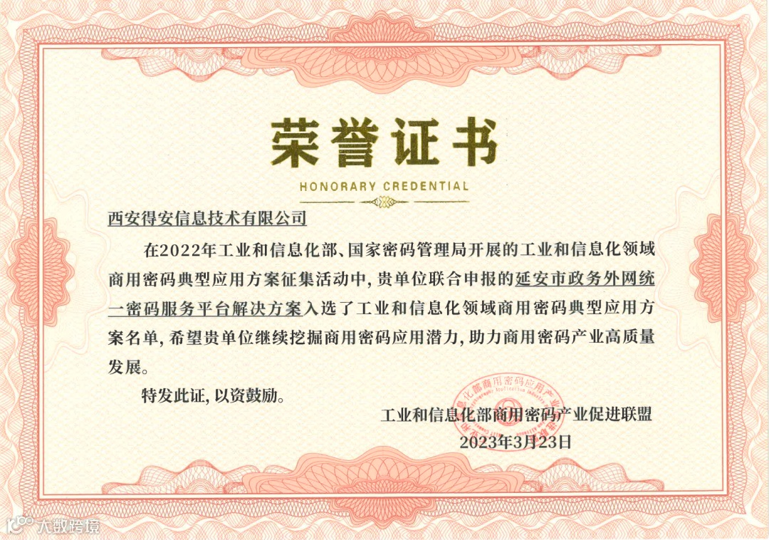 2023年2月得安公司传来喜报,得安建设的《延安市政务云信创密码应用项目》、《航天航空高端制造领域密码应用项目》二个项目方案成功列入国家工信部密码应用推广方案名录,并于3月23日在全国首届“工业和信息化领域商用密码应用峰会”上演讲并发布技术成果。