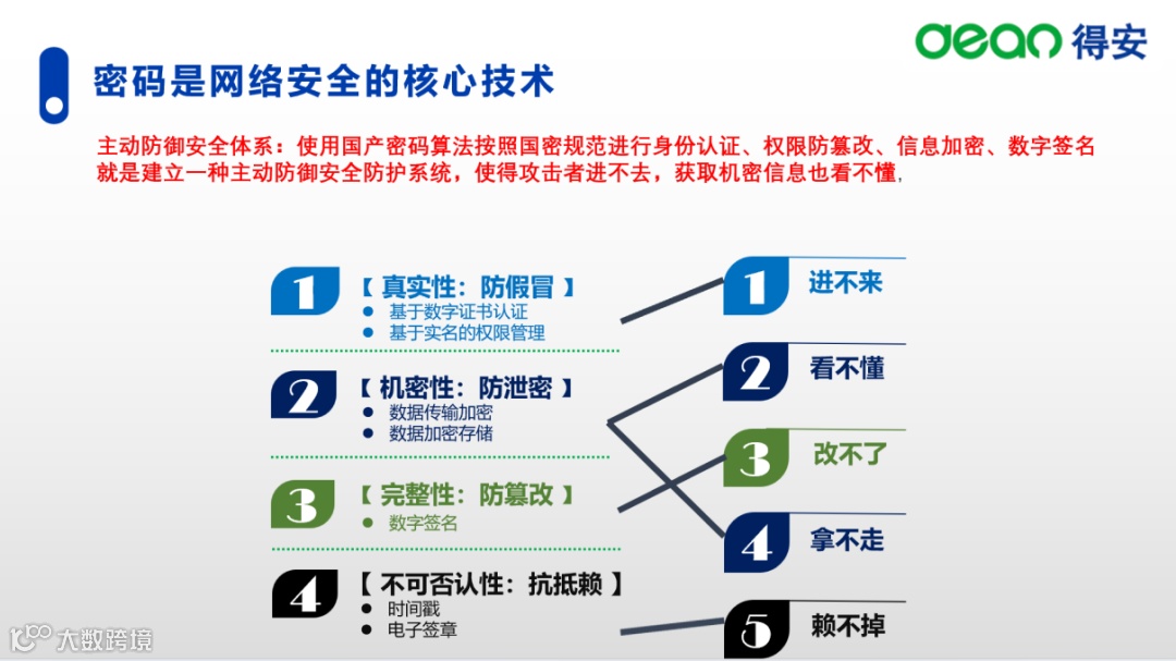 恩尼格玛密码最大的问题是不能让别人知道加密的规则。不同于恩尼格玛密码。在得安的解决方案里我们使用的是国产密码算法——SM2系列算法。国产密码算法的技术细节是公开的,但破解国产密码算法却是无法完成的难题。