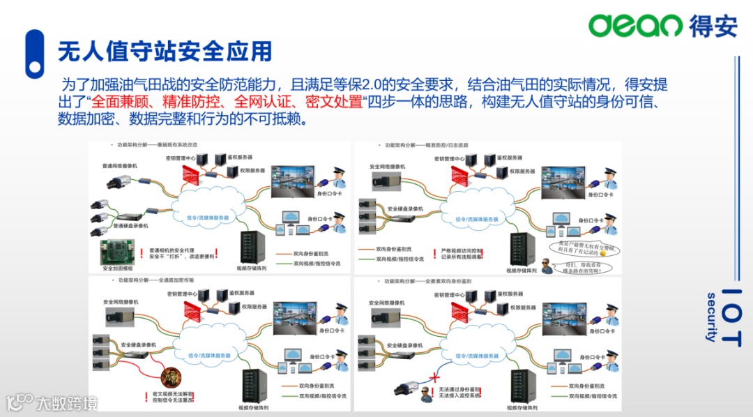如果用一句话来总结我上面的发言,那就是密码是保障网络安全的根本性技术。有了上面的铺垫,下面我结合石油行业谈谈得安对无人值守站安全应用的思考。
