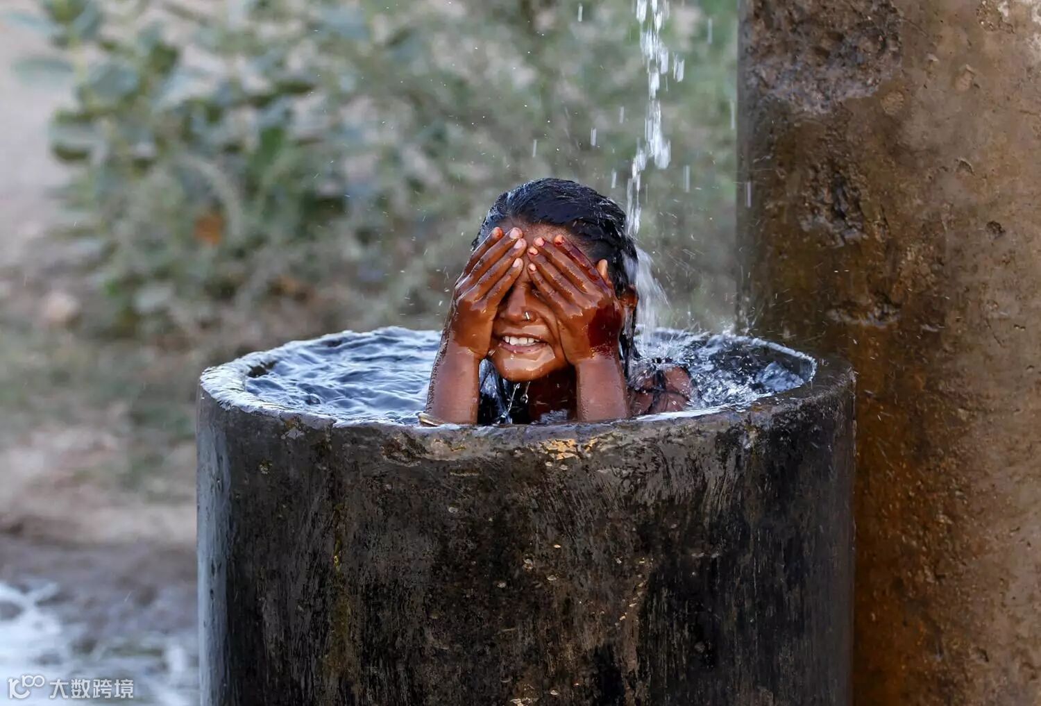 印度艾哈迈达巴德的郊区,一名女孩正用从破损水管中漏出的水洗澡。