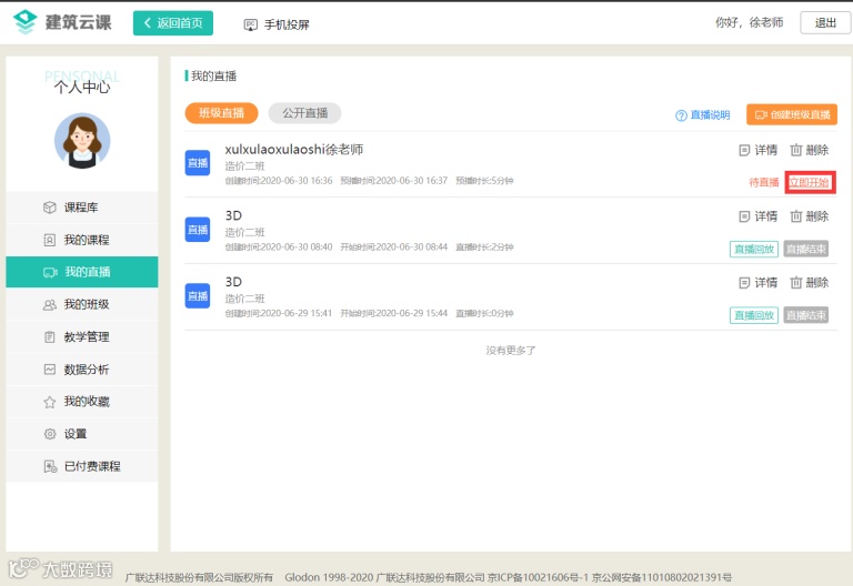 教师用户可以通过建筑云课发布直播,开展线上远程教学。老师可以创建以直播为主要特征,运用建筑云课内丰富的学习资源与教学功能的信息化教学新模式,实现接近课堂教学的效果。