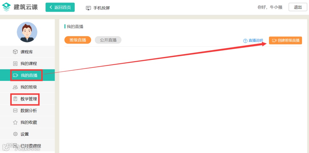 打开建筑云课网页端,“我的直播”及“教学管理”均可作为发布直播的入口,同样您可以选择发布班课直播或者发布公开课直播!