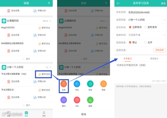 云课拥有6大课堂教学功能,包括直播、签到、任务、提问、讨论、投票,以发起任务为例—在班级界面点击“教学活动”,并点击“任务”按钮进入发布任务界面设定“发布时间”、“结束时间”、“视频是否能快进”,并添加对应的“资源”/“习题”即可。