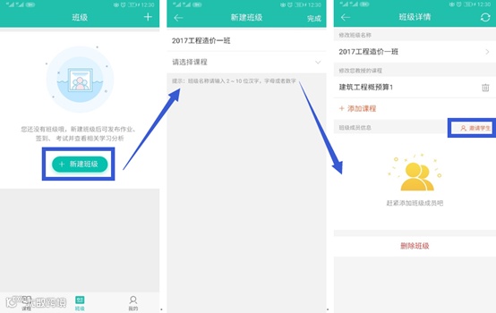 在“课程”界面,点击“新建班级”,输入班级名称并选择教授的课程。点击“邀请学生”,分享班级二维码到学生群,学生扫码或输入班级邀请码并填写信息即可加入班级。