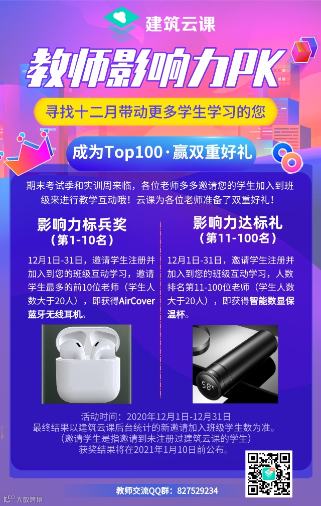 建筑云课期末考试季来临,建筑云课【教师影响力PK】活动火热进行中!寻找邀请学生加入班级学习-影响力最高的100位老师~