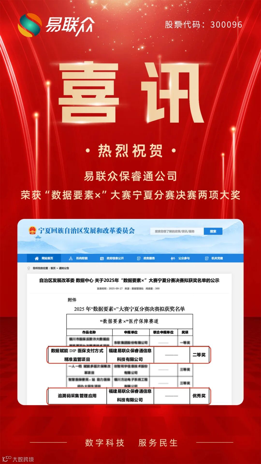 近日,2025年“数据要素×”大赛宁夏分赛决赛在银川国际交流中心圆满落幕。经成果路演、现场答辩、专家评审与赛道指导单位综合评定,福建易联众保睿通信息科技有限公司(以下简称“易联众保睿通”)凭借两大优质项目脱颖而出。其中,“数据赋能DIP医保支付方式精准监管项目”荣获医疗保障赛道二等奖,“追溯码采集管理应用”荣获医疗保障赛道优秀奖,彰显了易联众保睿通在医疗保障领域数据应用的硬实力。