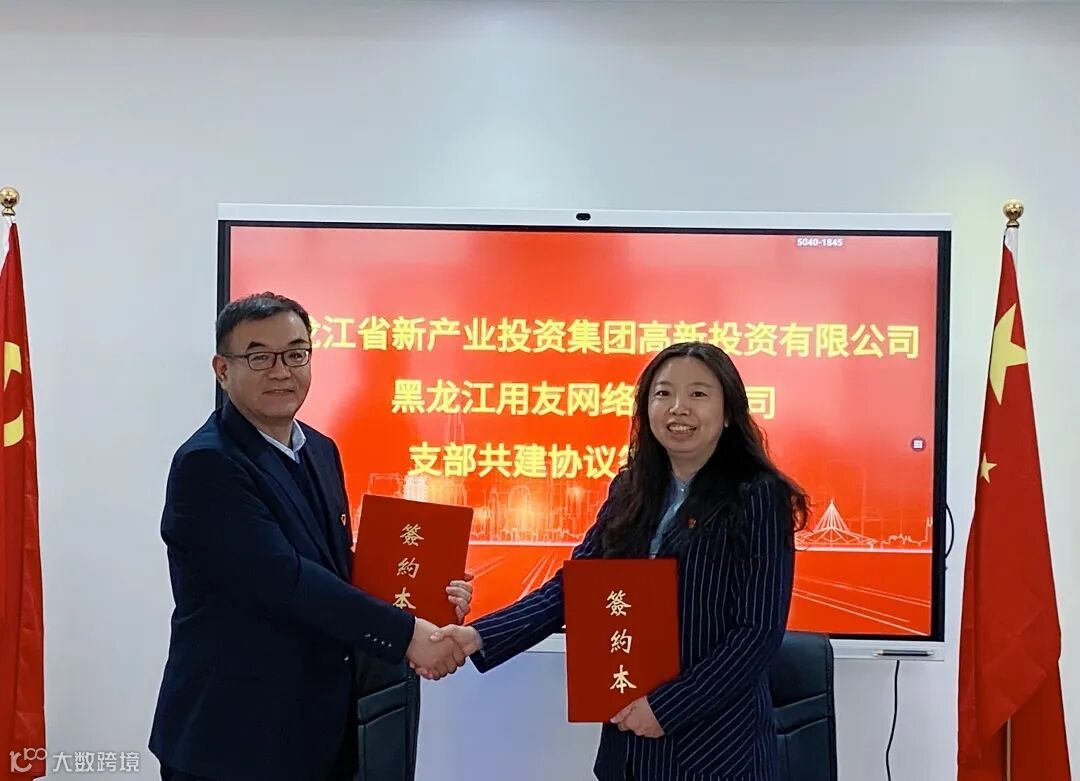 2023年4月6日,黑龙江省新产业投资集团高新投资有限公司与黑龙江用友网络科技公司支部共建协议活动圆满举行。公司党支部书记、总经理许越男出席签约仪式,公司党支部相关人员参加共建活动。