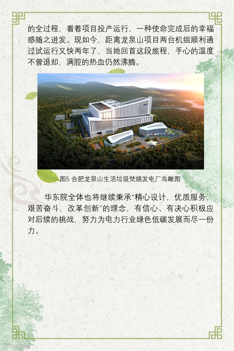 龙泉山项目投产后年处理垃圾约100万吨,平均年节约煤炭约15.31万吨,在为周围城镇提供生活垃圾无害化处理的同时,也推动了城镇向“垃圾零填埋”和“双碳”目标迈出重要一步。华东院也将继续秉承“精心设计,优质服务,艰苦奋斗,改革创新”的理念,努力为电力行业绿色低碳发展贡献智慧和力量。
