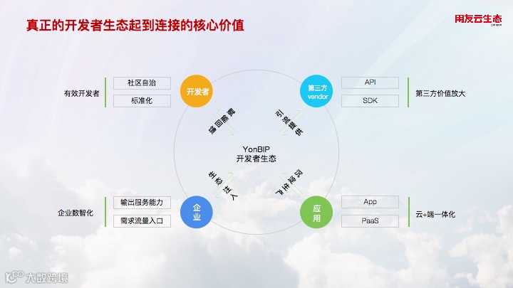 伴随着人工智能、云计算、大数据等技术集群的爆发,构建以开发者为主要创新力量的开发者生态已在业界形成广泛共识,特别是对于企业客户而言,开发者生态的可靠性与丰富性,已经成为影响产品服务是否被采用的关键因素。发布会中,用友网络副总裁兼生态产品部总经理邹达发表了题为《YonBIP开发者社区助力共建企业数智化生态》的主旨演讲。并指出:“开发者是作为技术型生态平台必须连接的重要组成,是不可或缺的一部分”。