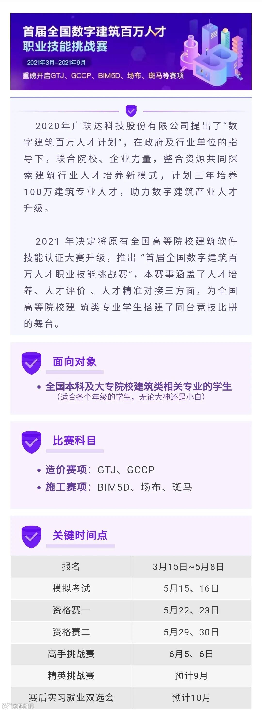 2021年,为承接数字建筑百万人才计划”广联达将同步启动院校(首届百万人才挑战赛)、企业(大型企业GIAC认证比赛)双赛道,采用同一套GIAC认证考评标准对人才进行评价,全力推进院校和企业的实施,打通院校和企业之间的人才输送的桥梁,为数字建筑领域培养百万人才的目标助力。