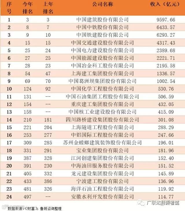 2017年7月31日,《财富》(中文版)发布了2017年中国企业500强排行榜,建筑业共有24家企业上榜,较去年增加3家。