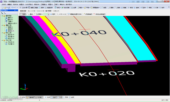 软件的cad识别功能十分好用,【内部点识别】功能可以快速的把路面识别出来,不管路面形状多么复杂,都完全没有问题,就简单的点几下路面工程就做完了,而且还可以定义路面结构层的加宽值,利用【动态观察】功能查看工程模型,可以清晰的看到一层一层的结构;