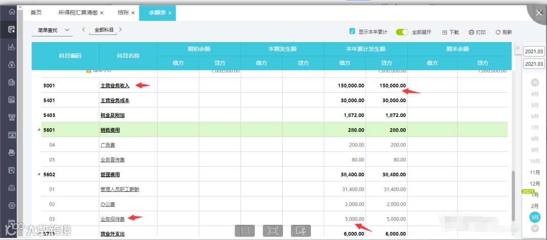 因涉及到余额表取数,针对此损益类科目(管理费用-业务招待费、主营业务收入、其他业务收入)需账规范做: