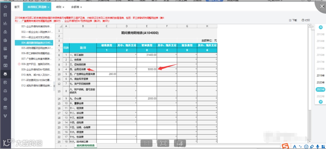 ①业务招待费支出取数参考:本期余额表中(管理费用-业务招待费(560203)这个科目的本年累计借方发生额)=5000元