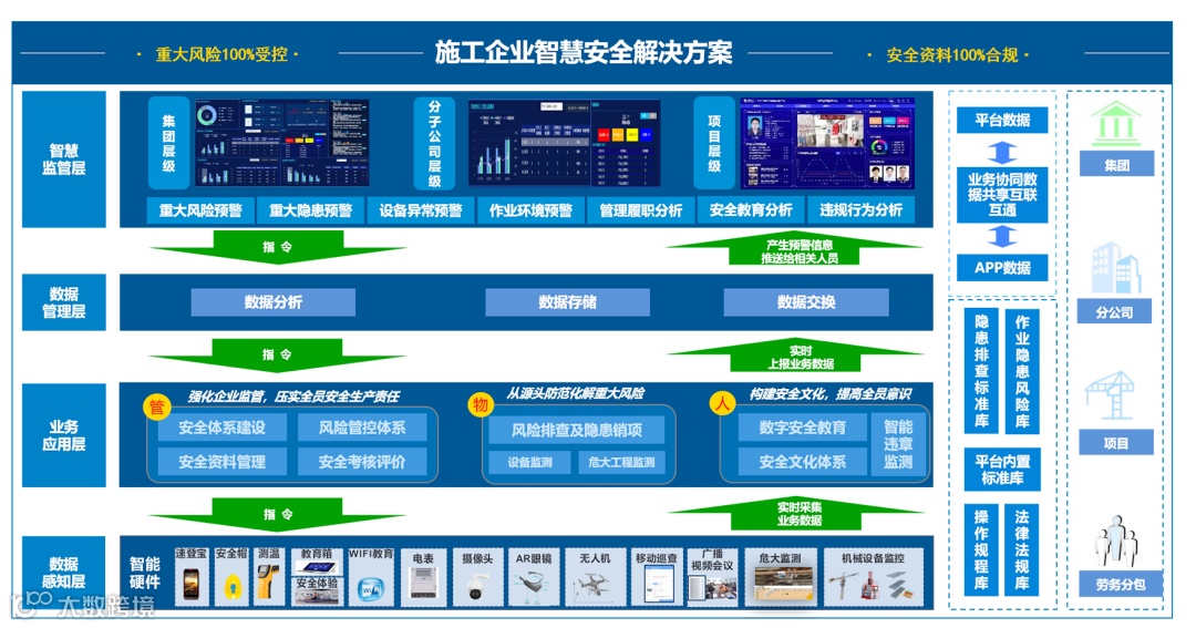方案的价值主张是通过搭建“三防一联动”的安全管理模式,联动企业和项目安全管理业务和数据,实现重大风险100%受控、安全资料100%合规,助力企业不出事、免责罚、提效率。